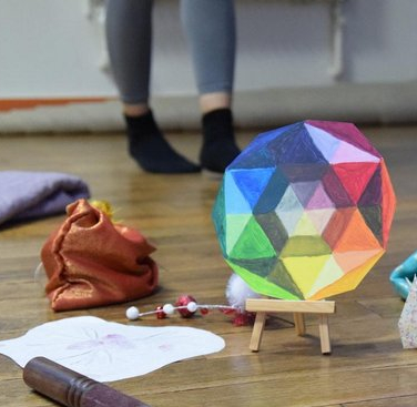 J’étais d’autant plus excitée par la proposition, qu’elle s’étendait à l’international avec une heure « centre/noyau » fixée à 17h27, heure de Paris. J’imaginais un lien par la danse à différents endroits de la planète avec ce petit réseau de danseurs-improvisateurs. Merci aux initiateurs de cette rencontre. Cela me procurait une telle sensation d’effervescence intérieure, que pour l’occasion, quelques heures auparavant, j’ai préparé et rassemblé tous plein d’objets artistiques : des foulards, des colliers, des billes, une kalimba*. J’étais ravie que s’animent toutes ces couleurs, ces textures, ces formes différentes. Je me sentais invitée à me parer, jouer, honorer, fêter et faire apparaître ce qui était vivant à l’intérieur dans une expression partagée avec d’autres ?