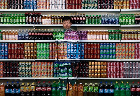 Illustration : Supermarket Art par Liu Bolin -waits for his colleagues to put a finishing touch on him to blend into rows of soft drinks in his artwork entitled « Plasticizer » to express his speechlessness at use of plasticizer in food additives, in his studio at the 798 Art District in Beijing, China, Wednesday, Aug. 10, 2011. (AP Photo)
