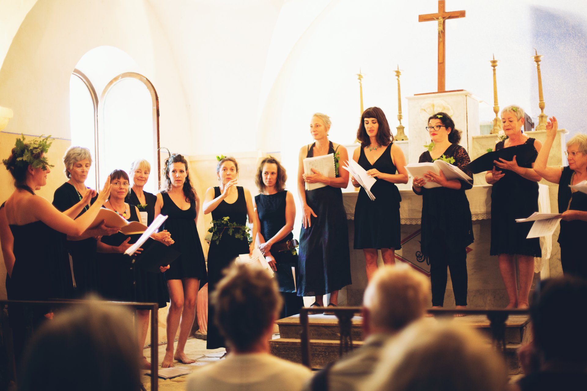 Le concert était programmé dans une petite chapelle nichée en hauteur de la montagne de Beaumont-en-diois dans la Drôme. Alors que j’y suis arrivée en retard, j’ai commencé à entendre les chants et des sons, des bruits comme des cris d’oiseaux au fur et à mesure que je m’approchais. Cette ambiance m’a piqué de curiosité, l’étrangeté de la situation a suscité mon étonnement. Lorsque je suis entrée dans la chapelle, j’ai été littéralement éblouie par le tableau : un choeur de femmes chantant au centre d’une chapelle avec une lumière bleue et blanche diaphane. Quelle puissance et quelle singularité !