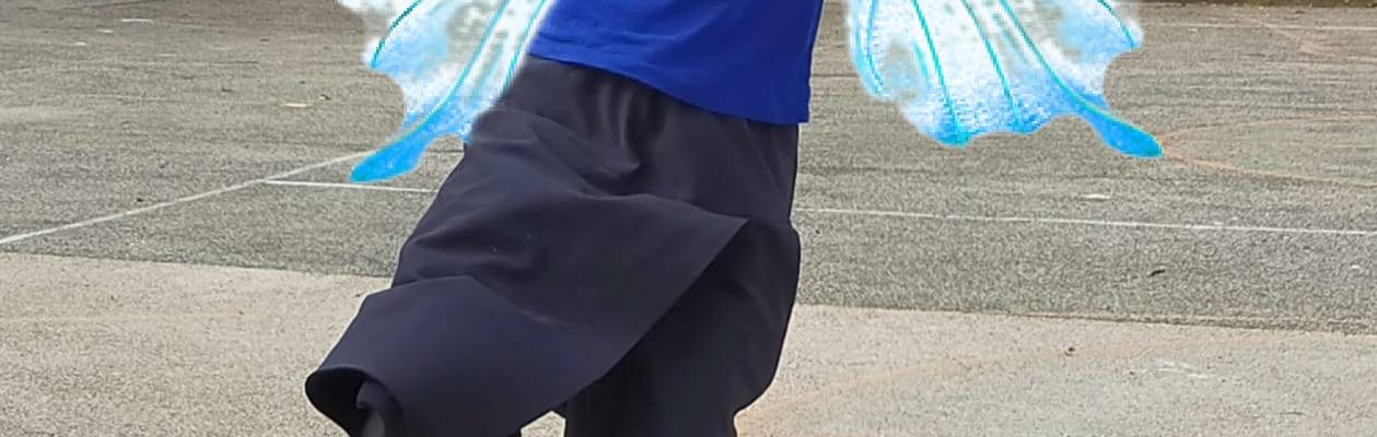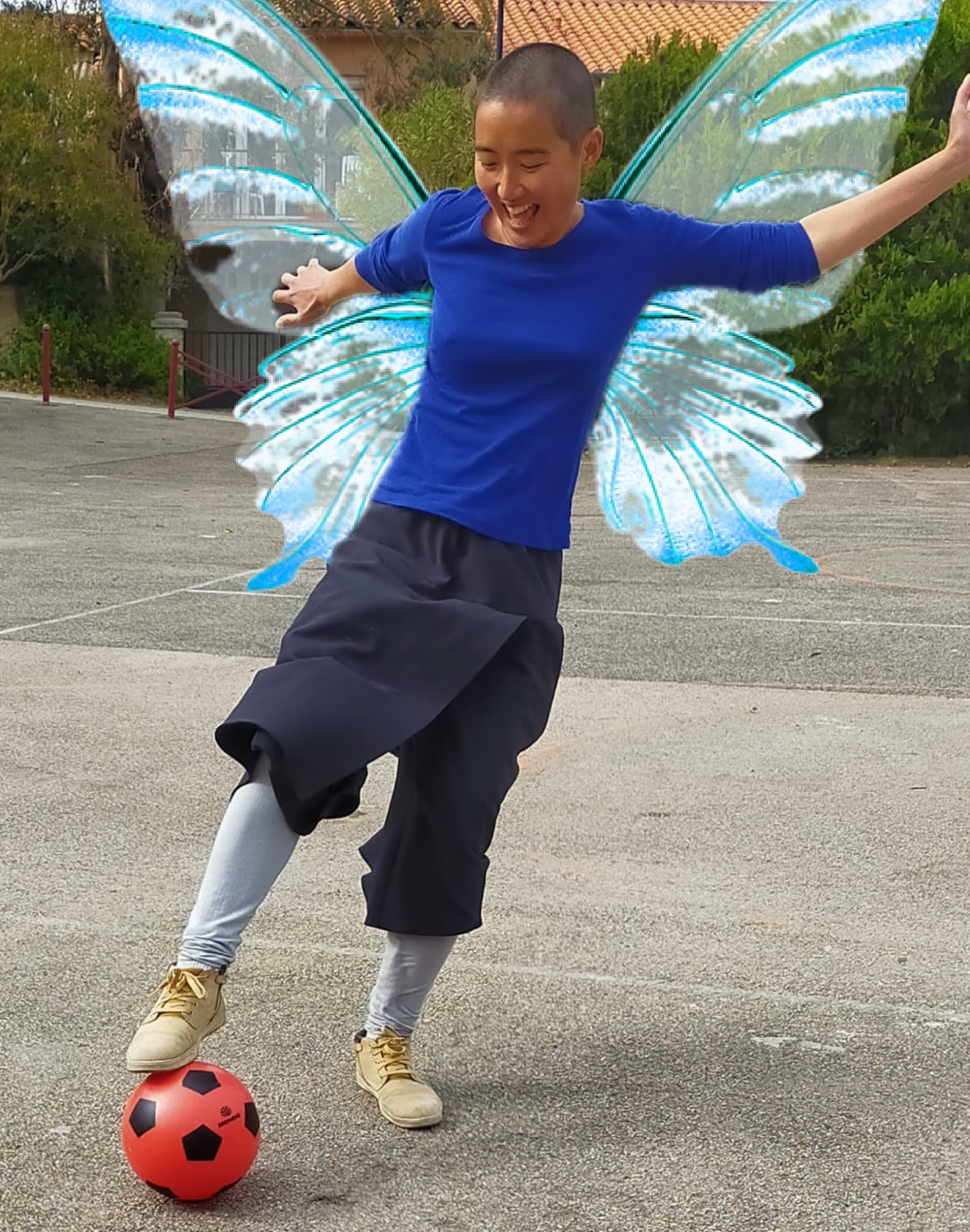 En avril, mon amie Fabienne a immortalisé cette boule à zéro en photo alors que j’étais en plein exploit footballistique. Puis elle m’a fait la farce de me maquiller avec un logiciel pour me parer d’ailes de papillon. Oh oui quitter l’image de l’artiste à l’image bien lêchée, ça fait du bien, merci !