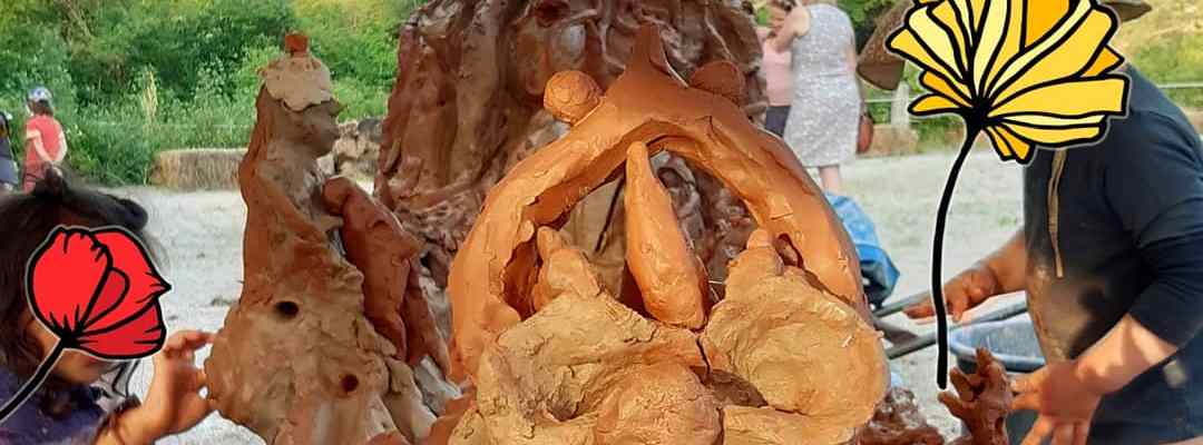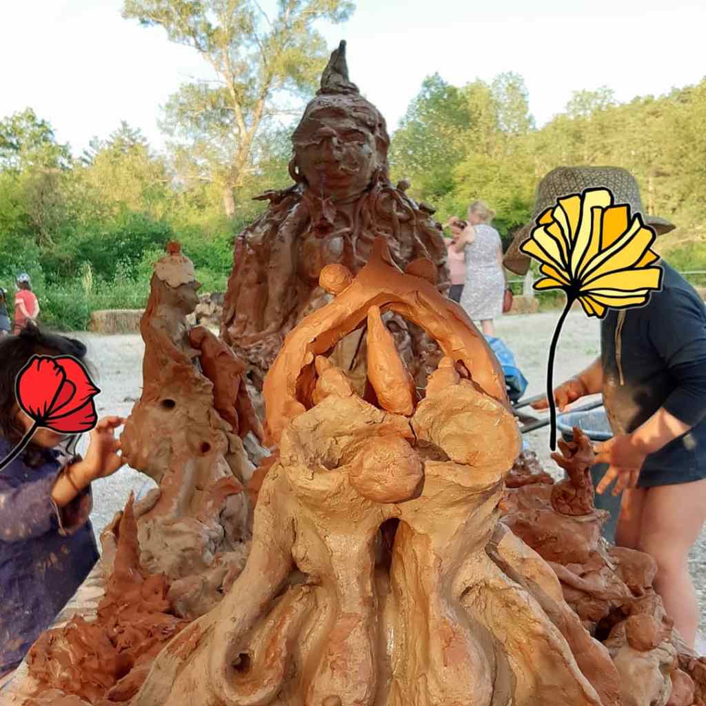 Cette photo est issue d’un atelier terre pour une sculpture collective éphémère lors d’un événement festif : des enfants ravis et des parents émerveillés. Cet événement était organisé par « Femmes Répit » une association de soutien aux femmes victimes de violences conjugales.