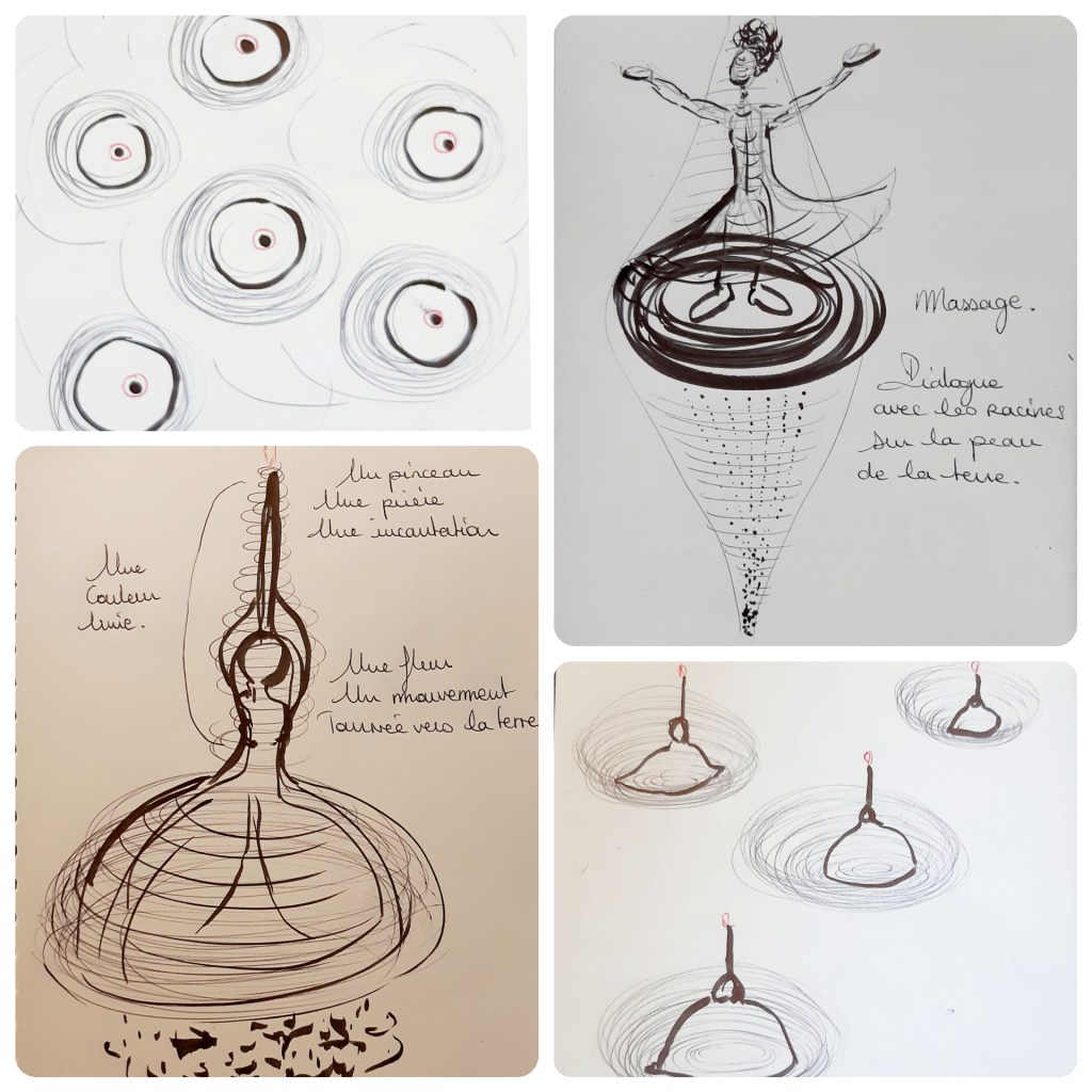 Le 22 septembre 2020, j’écrivais un texte et dessinais quelques lignes « Des fleurs humaines, tournées vers la terre, dessinent sur le sol, avec leurs pieds, leurs pas. Leurs tours émettent des vibrations, devant, derrière, en-dessous, au-dessus. C’est un vortex d’énergie pour la Terre et les peuples qui l’habitent.«