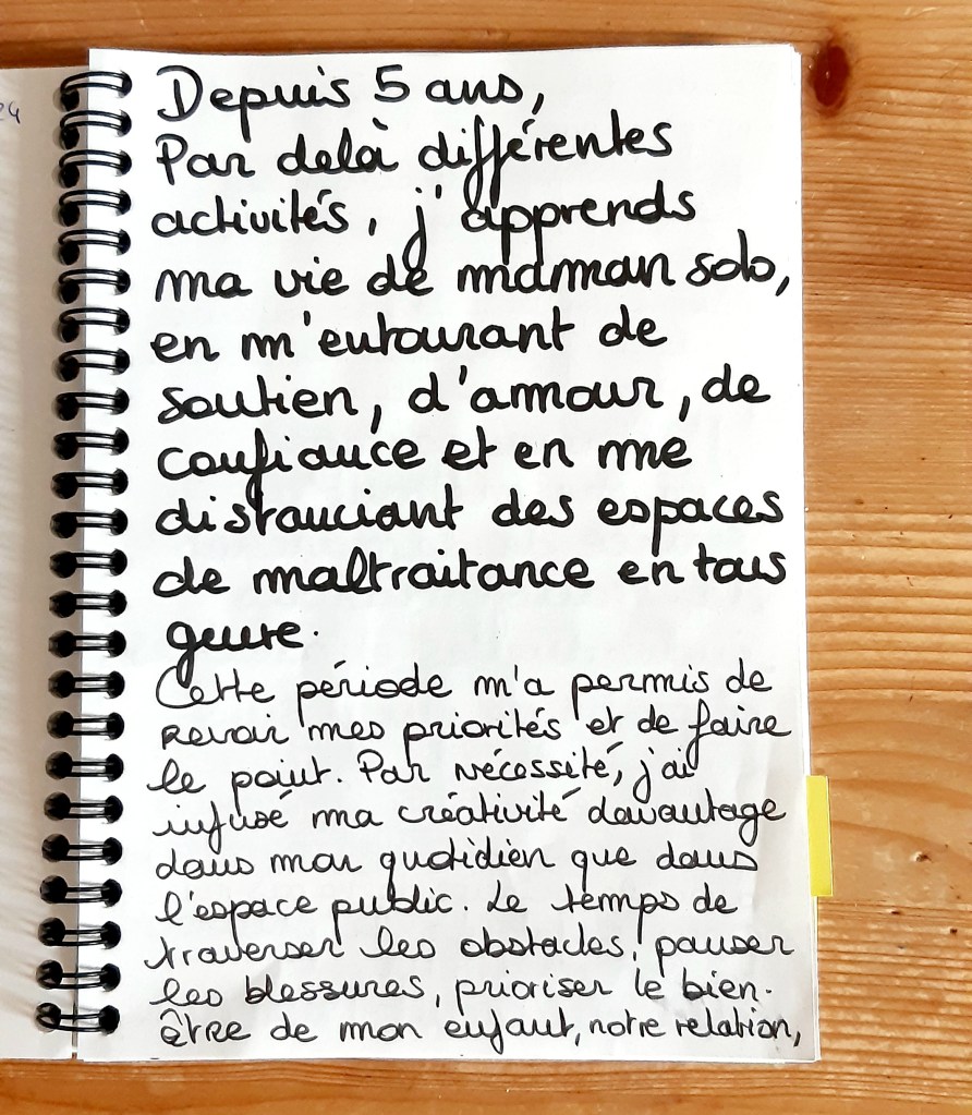 Depuis 5 ans, par delà différentes activités, j’apprends ma vie de maman solo, en m’entourant de soutien, d’amour, de confiance et en me distanciant des espaces de maltraitance en tous genre. Cette période m’a permis de revoir mes priorités et de faire le point. Par nécessité, j’ai infusé ma créativité davantage dans mon quotidien que dans l’espace public. Le temps de traverser les obstacles, panser les blessures, prioriser le bien-être de mon enfant, notre relation, ainsi que ma santé mentale et physique. J’espère que vous comprenez mieux pourquoi j’ai déserté les réseaux sociaux. Même si ce n’est pas toujours évident, je tâcherai de revenir progressivement ici.