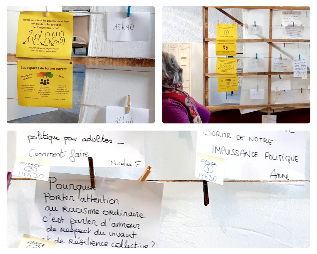 Un forum ouvert, outil accessible à toustes, mobilise l’intelligence collective, favorise le dialogue et le partage d’initiatives : après un premier temps d’agora, des sujets de discussion sont proposés à un créneau et un emplacement précis. L’ensemble des participant.e.s au forum se répartissent alors, en plus petits groupes. Des compte-rendus sont élaborés pour chaque discussion afin de collecter une trace et inscrire le processus dans la durée.