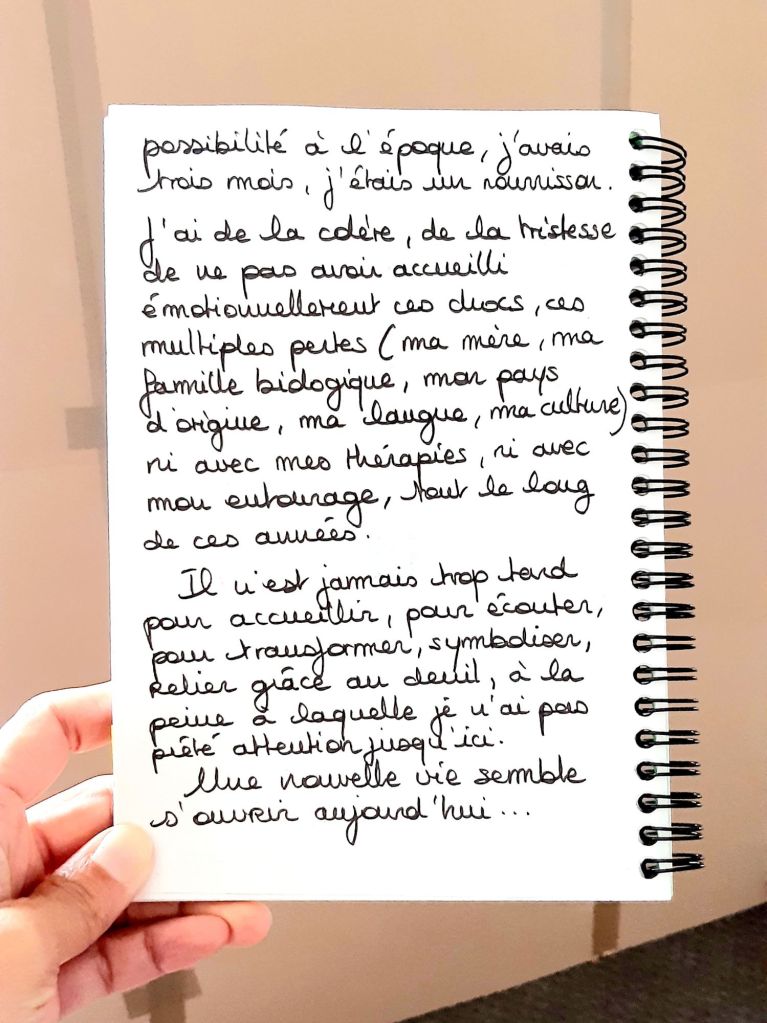 Récemment, j’ai éprouvé de la colère, de la tristesse, de ne pas avoir accueilli émotionnellement, avec le corps, ces chocs, ces multiples pertes (ma mère, ma famille biologique, mon pays d’origine, ma langue, ma culture), ni avec mes thérapies diverses et variées, ni avec mes engagements militants, ni avec mon entourage, tout le long de ces années.
