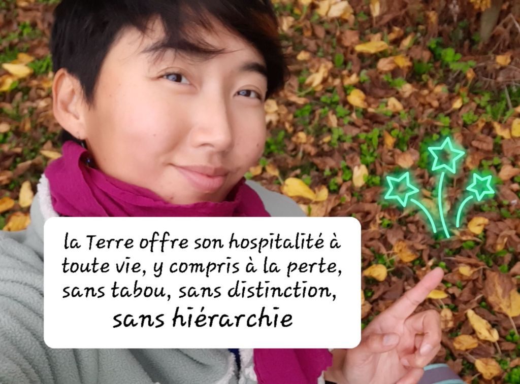En mettant les pieds dans la terre, je réalise que la Terre offre son hospitalité à toute vie, y compris à la perte, sans tabou, sans distinction, sans hiérarchie.