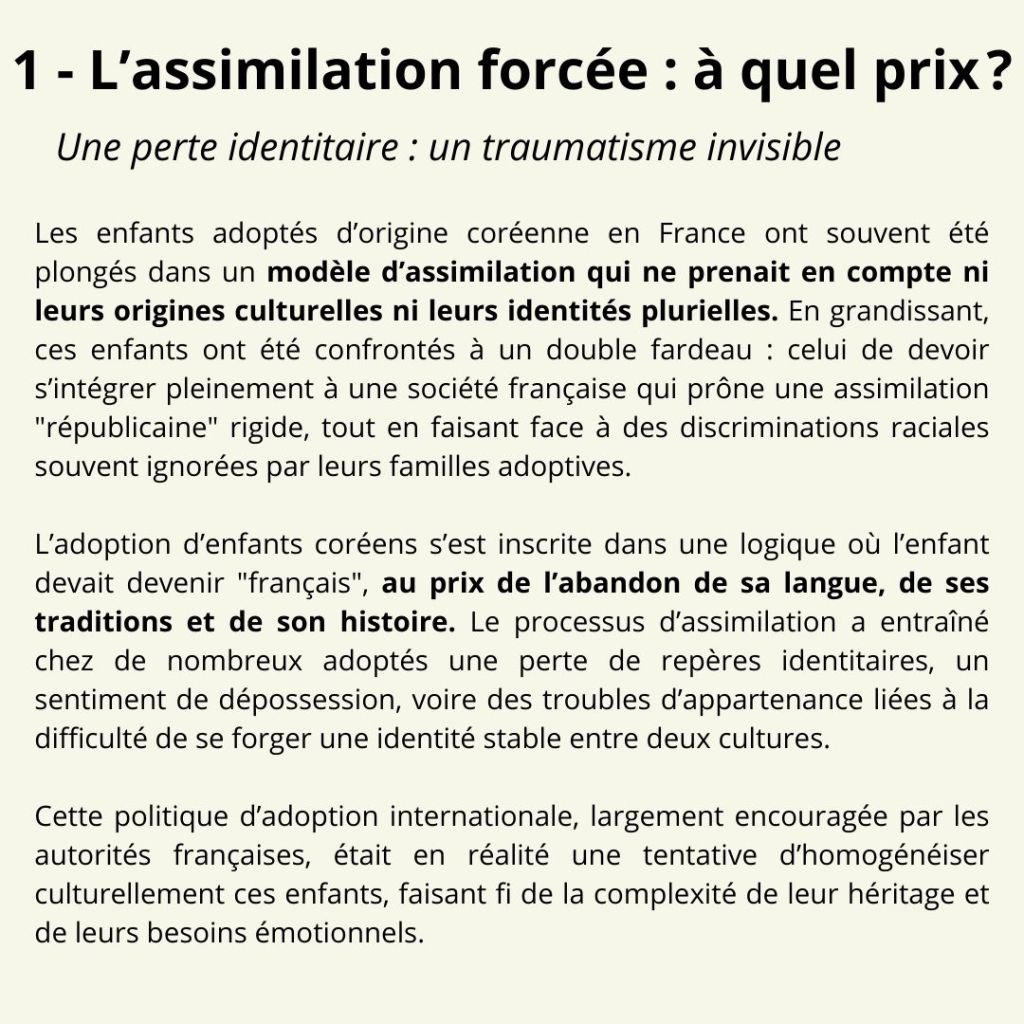L’adoption d’enfants coréens s’est inscrite dans une logique où l’enfant devait devenir « français », au prix de l’abandon de sa langue, de ses traditions et de son histoire. Le processus d’assimilation a entraîné chez de nombreux adoptés une perte de repères identitaires, un sentiment de dépossession, voire des troubles d’appartenance liées à la difficulté de se forger une identité stable entre deux cultures.