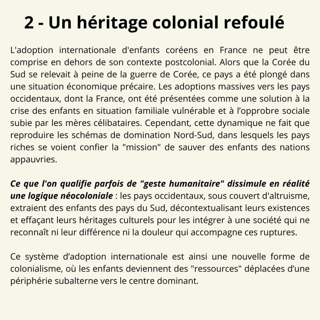 L’adoption internationale d’enfants coréens en France ne peut être comprise en dehors de son contexte postcolonial. Alors que la Corée du Sud se relevait à peine de la guerre de Corée, ce pays a été plongé dans une situation économique précaire. Les adoptions massives vers les pays occidentaux, dont la France, ont été présentées comme une solution à la crise des enfants en situation familiale vulnérable et à l’opprobre sociale subie par les mères célibataires. Cependant, cette dynamique ne fait que reproduire les schémas de domination Nord-Sud, dans lesquels les pays riches se voient confier la « mission » de sauver des enfants des nations appauvries.