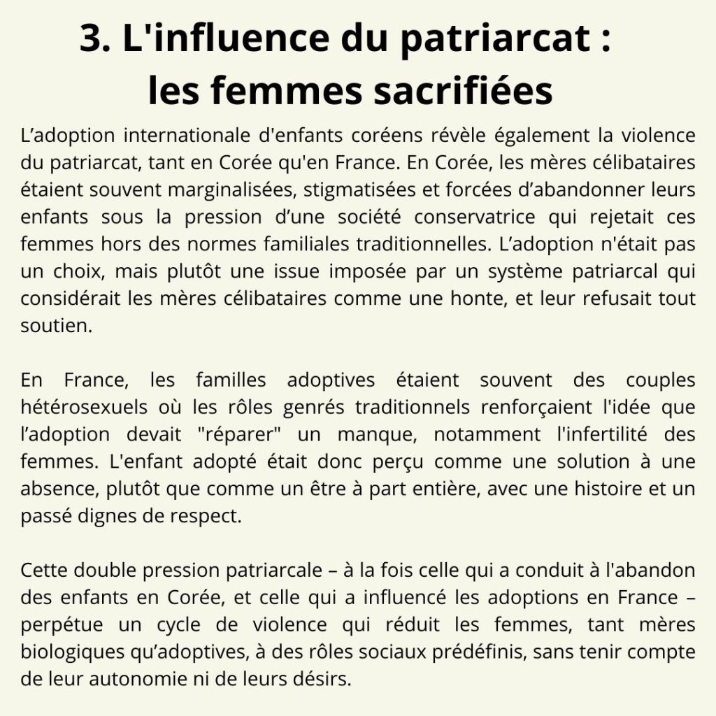 L’adoption internationale d’enfants coréens révèle également la violence du patriarcat, tant en Corée qu’en France. En Corée, les mères célibataires étaient souvent marginalisées, stigmatisées et forcées d’abandonner leurs enfants sous la pression d’une société conservatrice qui rejetait ces femmes hors des normes familiales traditionnelles. L’adoption n’était pas un choix, mais plutôt une issue imposée par un système patriarcal qui considérait les mères célibataires comme une honte, et leur refusait tout soutien.