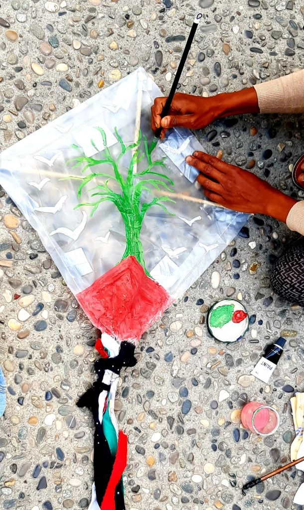 En Palestine le cerf-volant s’élève au dessus des murs et des barbelés portant les rêves d’un peuple enfermé, mais debout. Symbole d’enfance, de liberté, de dignité, il relie la terre blessée au ciel ouvert, d’un fil fragile mais tenace, comme l’espérance de nos présences.