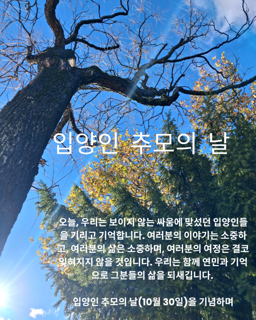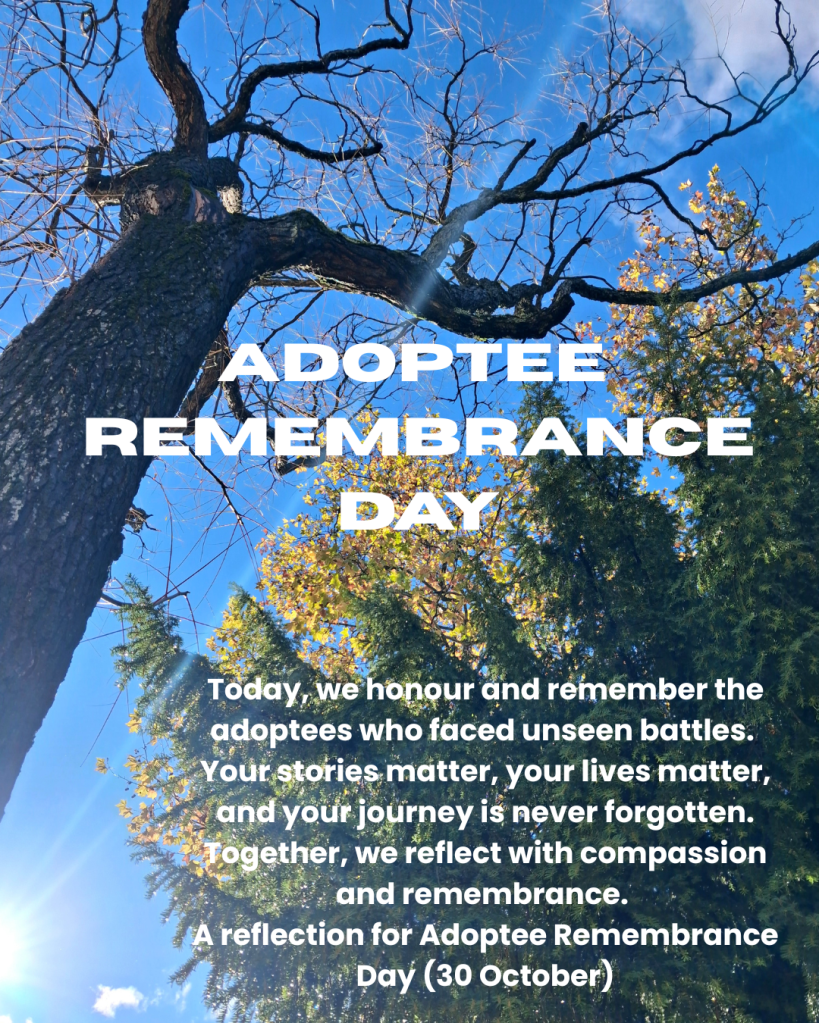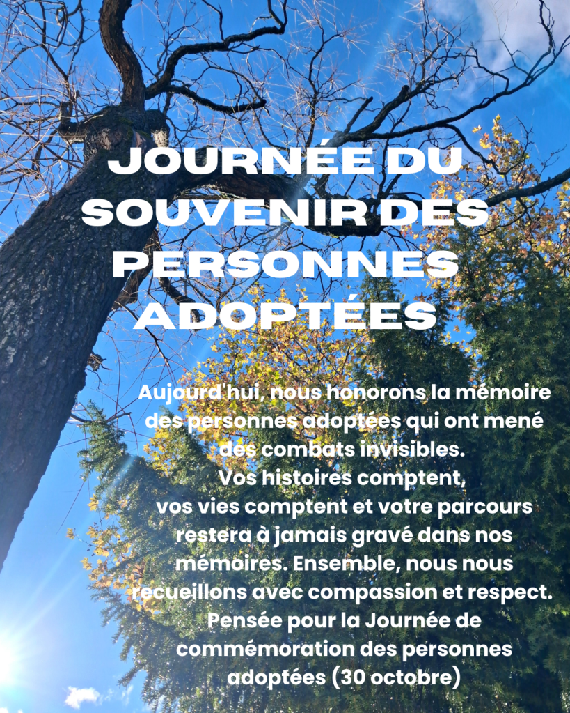 Aujourd’hui, 30 octobre, nous honorons la mémoire des personnes adoptées. Nos histoires comptent, nos vies comptent, notre mémoire compte. Ensemble, nous nous recueillons avec compassion et respect.