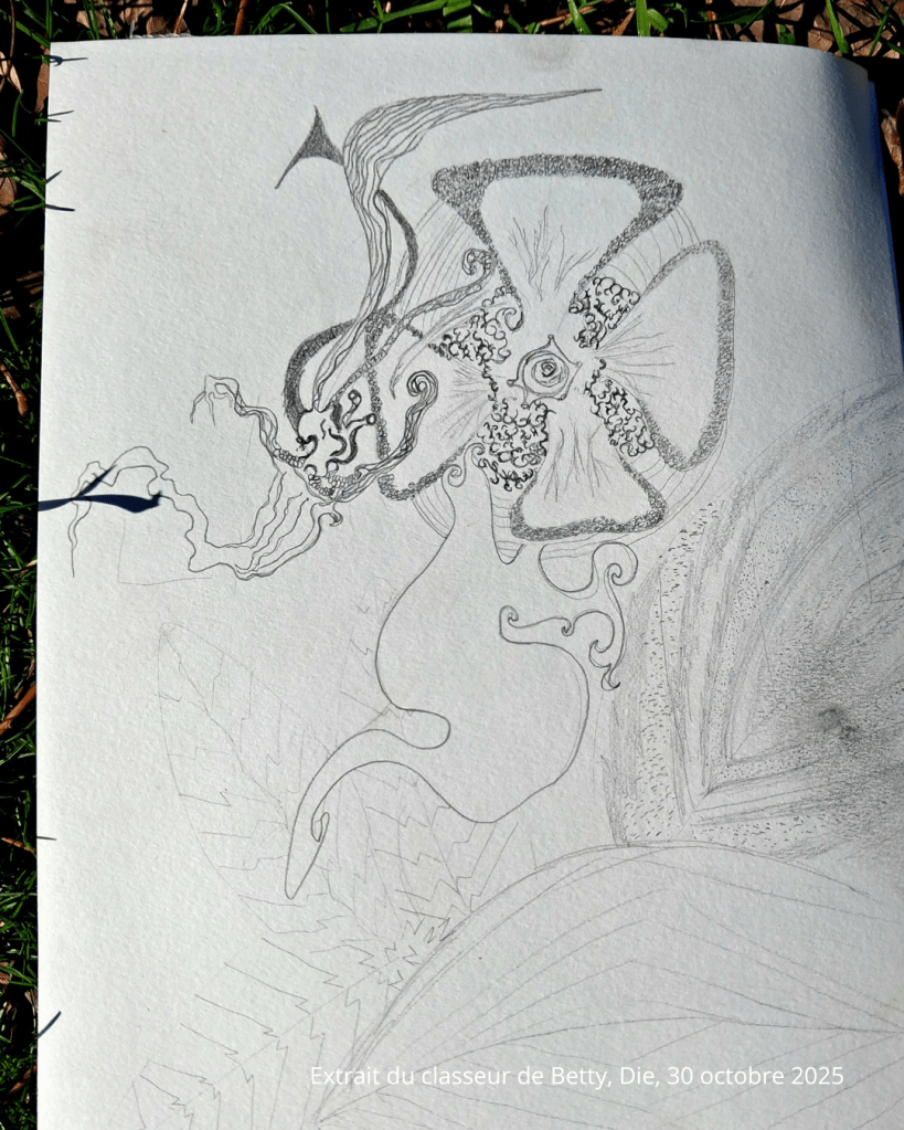 Je ne t’ai pas connu en personne, Betty, mais je rencontre tes mots aujourd’hui. Je ne sais pas par où commencer en ouvrant le classeur. Oh, un dessin ! Puis des textes plein de poésie, de vie, de douleur aussi. Celle par laquelle, souvent, passe le langage du cœur. Je me sens touchée, honorée de rencontrer ta sensibilité.
