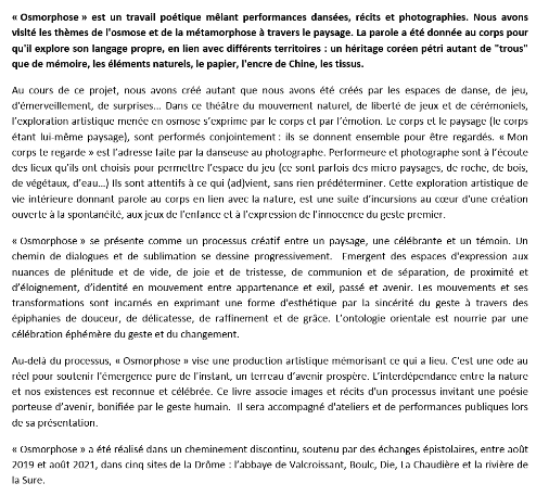 « Osmorphose » est un travail poétique mêlant performances dansées, récits et photographies. Nous avons visité les thèmes de l’osmose et de la métamorphose à travers le paysage. La parole a été donnée au corps pour qu’il explore son langage propre, en lien avec différents territoires : un héritage coréen pétri autant de « trous » que de mémoire, les éléments naturels, le papier, l’encre de Chine, les tissus.
